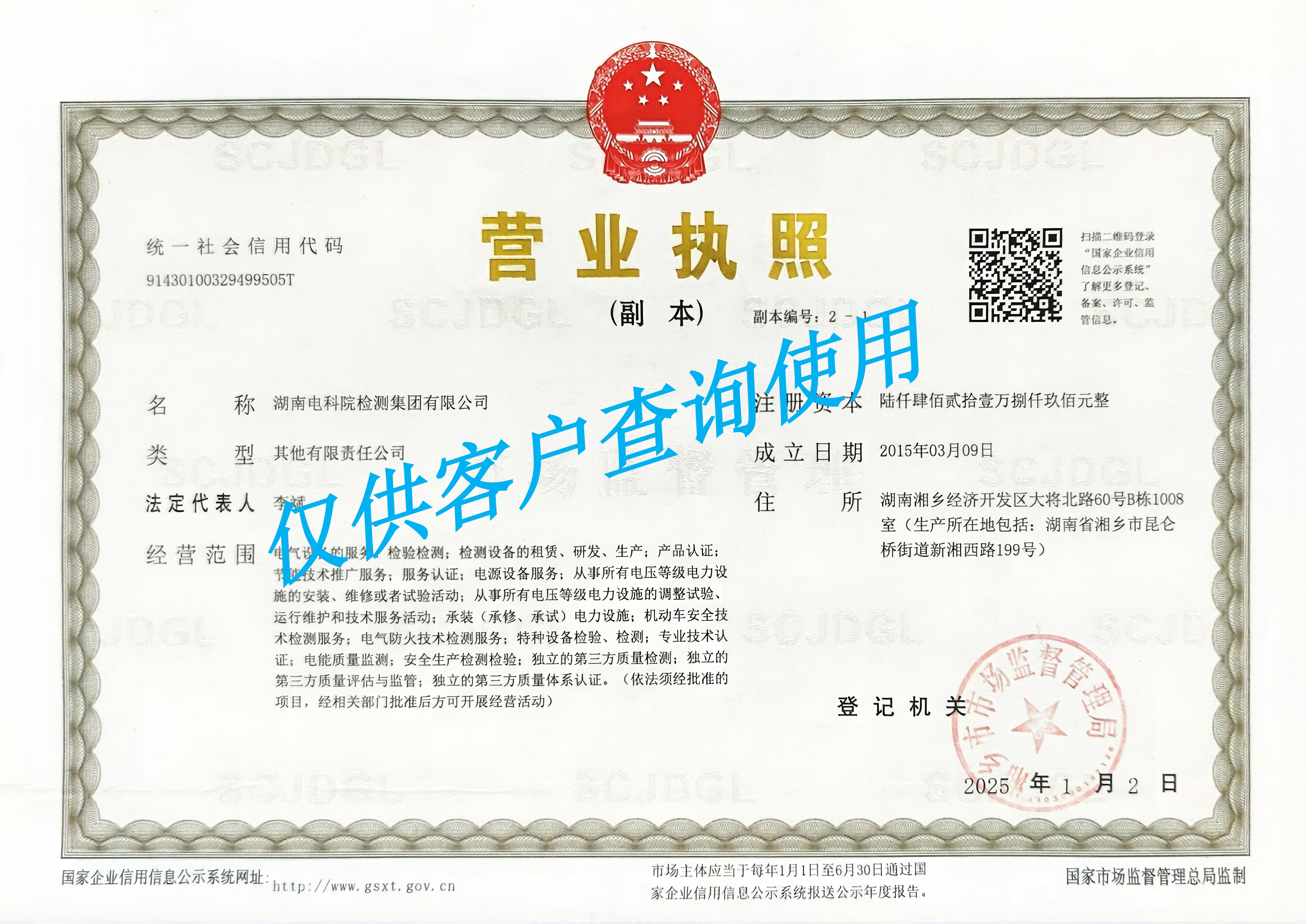 “湖南电科院检测集团有限公司”营业执照副本